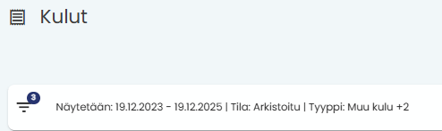 Löydät arkistoituja kulujasi kätevästi kulukohdasta suodattamalla hakusanaksi arkistoitu, jolloin näet kaikki arkistoidut kulusi haluamaltasi ajalta. Suodattimen löydät vasemmalta hampurilaisvalikosta ja klikkaamalla sitä pääset valitsemaan mitä kulujasi haluat katsella ja miltä ajalta.